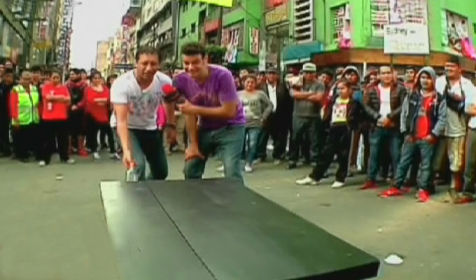 Un equipo de Al Sexto Día llegó hasta el corazón de Gamarra con un genial reto que hizo divertir a las personas. Se trata del toque-toque, un desafío que consiste en lanzar una botella de plástico sobre una mesa y ésta debería caer parada. Para ello, se trajo como jurado al genial Marco Antonio Melosevich.