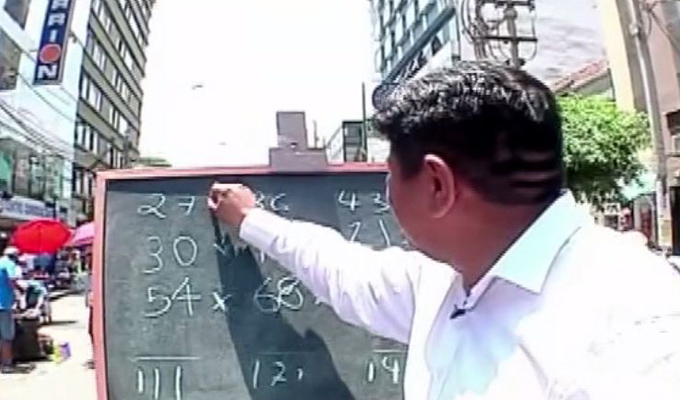 Para hacer perder el miedo a la población y para que vean lo fácil que es multiplicar, sumar, restar o dividir, citamos a Arturo Mendoza, quien es conocido por su habilidad para resolver operaciones numéricas en segundos. Con él un equipo de Al Sexto Día se dirigió a las calles de Gamarra, en el distrito de La Victoria, para que asuma el reto que diversos ciudadanos le impondrían.