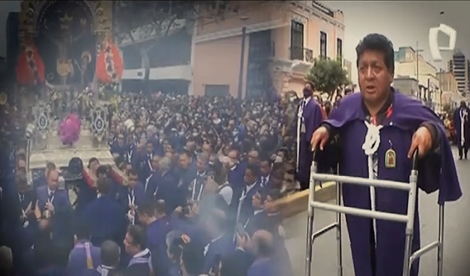 El cómico ambulante conocido como Pompinchú llegó a la última salida del Señor de los Milagros para encomendarse por el dolor crónico que aqueja a sus caderas. Katy Sheen lo acompañó a lo largo de la procesión, donde el artista pidió por el alivio de sus dolencias al Cristo Moreno.