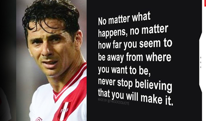 En una imagen compartida en el Instagram de Claudio Pizarro se puede leer en ingles "No matter what happens, no matter how far you seem to be away from where you want to be, never stop believing that you will make it" (No importa lo que suceda, no importa qué tan lejos parezcas estar de donde deseas estar, nunca dejes de creer que lo lograrás). Y al pie de esta, se lee lo siguiente: "Nunca dejes de creer, ¡lo conseguirás!".