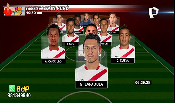 Pedro Gallese, Aldo Corzo, Christian Ramos, Luis Abram, Marco López; Renato Tapia, Yoshimar Yotún; Sergio Peña, André Carrillo, Christian Cueva y, como punta, Gianluca Lapadula.