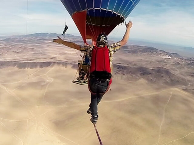 El famoso equilibrista Andy Lewis volvió a desafiar a la gravedad caminando entre dos cables ubicados entre dos globos aerostáticos, a una altura de 1.200 metros.