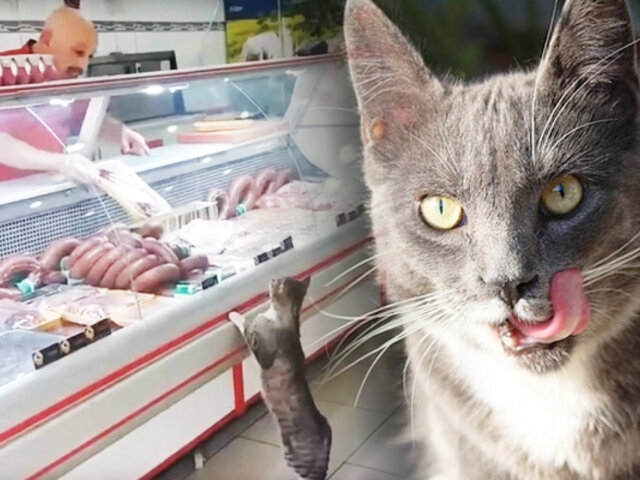 Al final el carnicero le corta un trozo de carne y se lo lanza al otro lado del mostrador y el felino resobe con mucho gusto.