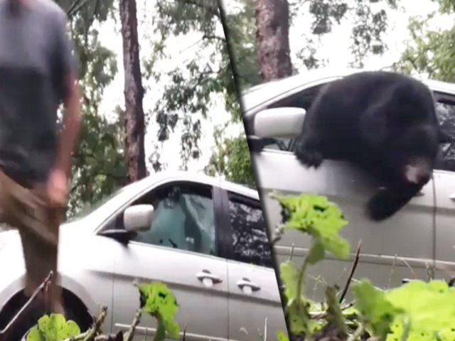 En las imágenes se ve como uno de los integrantes de la familia, desde afuera intenta abrir la manija del auto, para que el animal pueda salir, pero al oso poco le importó, rompió un vidrio con la fuerza de su garras y salió muy tranquilo del auto.