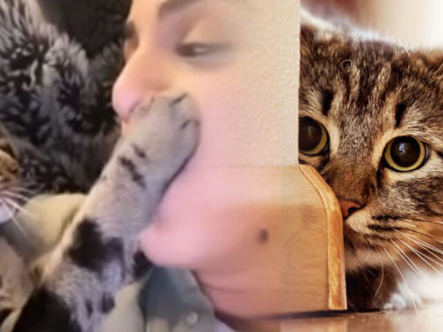 En el momento en el que la dueña alza la voz, el felino intenta ponerle la pata sobre los labios para callarla, ya que quiere toda su atención para él.