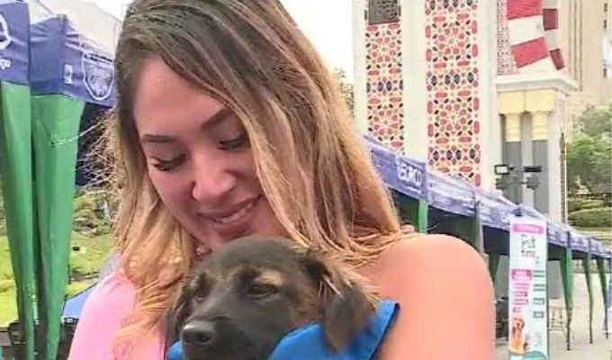 La reportera Tifanny Tipiani se mostró notoriamente emocionada al sostener en sus brazos a un perrito durante una campaña de adopción en el distrito de Surco.