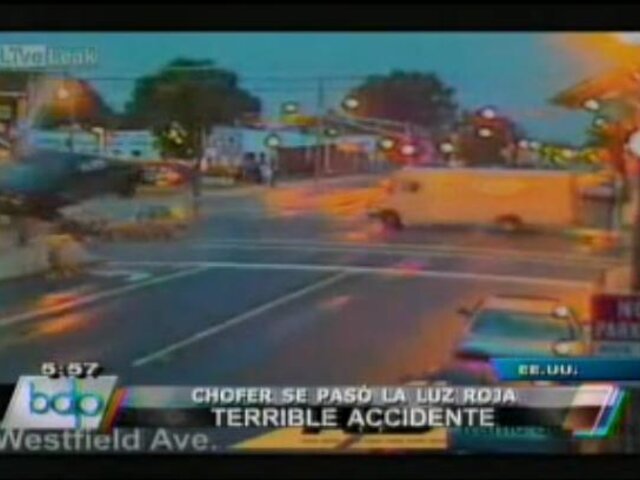 En estados unidos, un automóvil se pasa la luz roja y ocasiona un terrible accidente de tránsito. Afortunadamente el choque no dejó muertos que lamentar. Buenos Días Perú.