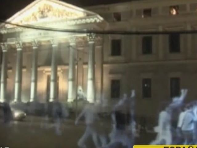 Ciudadanos proyectaron formas holográficas de manifestantes frente al Congreso de los Diputados, en protesta contra la denominada 'ley mordaza'