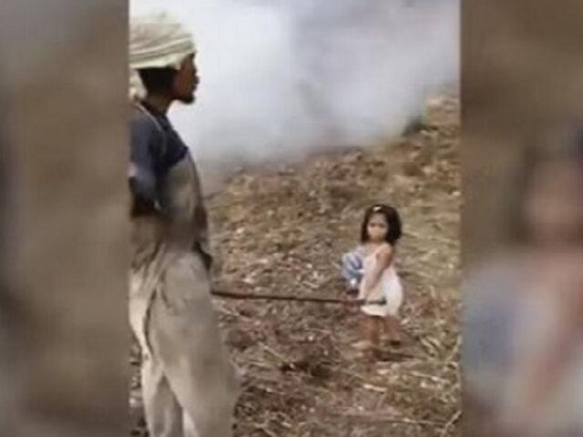 Utilizando un palo e incluso descalza, la pequeña guía cada día a su padre ciego para que pueda llegar a su trabajo, en una granja de cocos.