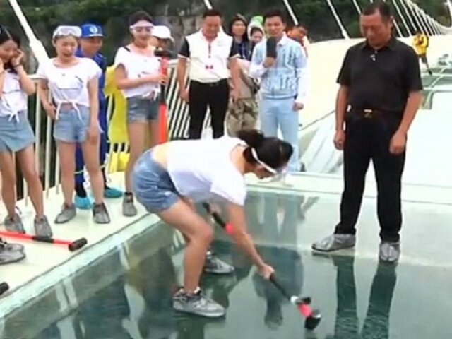 Para verificar que en verdad el vidrio resiste un peso considerable, decenas de personas golpearon varias veces la lámina de vidrio con una comba.