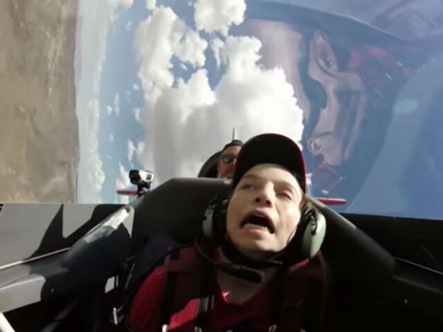 En la grabación, Riley de 12 años, disfruta del vuelo, de pronto el aeroplano da un giro de 360° y tras unos segundos, el menor pierde la conciencia y se desmaya. Al despertar celebran junto al piloto por la hazaña.