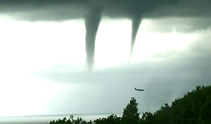 Pero lo que más llamó la atención de los videos grabados, fue un avión que se dirigía hacia donde estaban los gigantescos tornados. La aeronave atravesó sin dificultad la zona pero captó la atención de los aficionados ante la amenaza latente de ser tragados por la fuerza del aire; sin embargo, minutos más tarde aterrizó sin problemas.