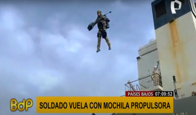 Cada vez más la tecnología hace posible lo que antes creíamos nunca sucedería. Esta vez, un ‘soldado volador’ utilizó una mochila propulsora para trasladarse de un barco a otro en Holanda.