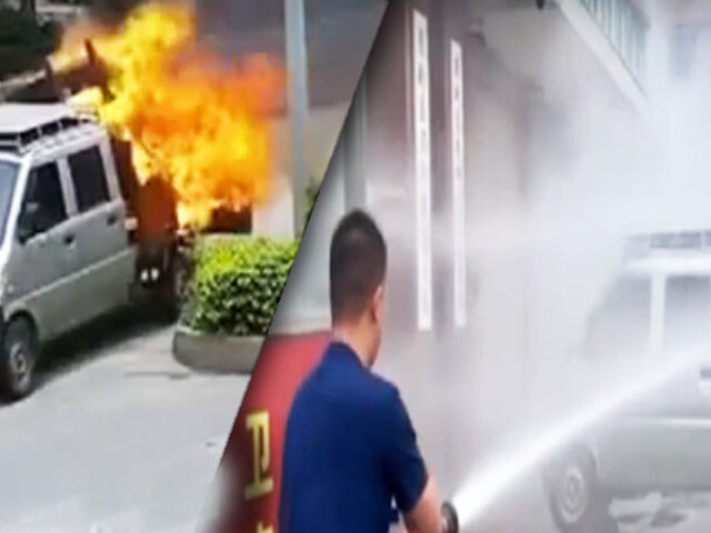 En China, una cámara de seguridad registró el momento cuando un conductor llegó con su camioneta envuelta en llamas para pedir ayuda en una estación de bomberos. El incidente ocurrió en la ciudad de Guangdong.
