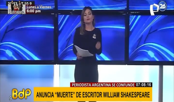 La presentadora relataba la noticia sobre el deceso y resaltó la importancia del dramaturgo inglés, quien falleció en 1616. Sin embargo, se trataba de otra persona que también llevaba su nombre.