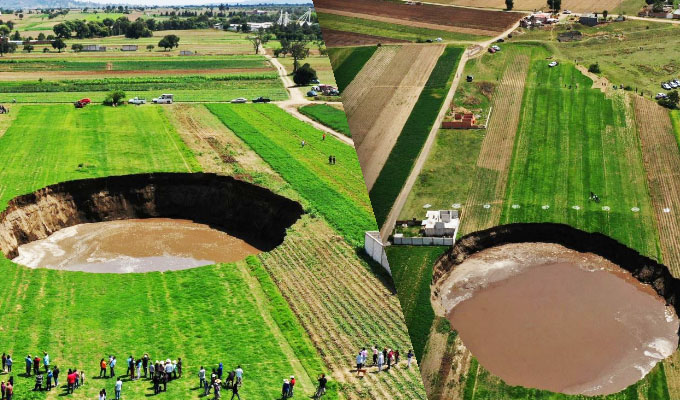 Según testigos, primero tenía cinco metros de diámetro, pero en solo horas se extendió hasta alcanzar los 60 metros de diámetro y los 20 metros de profundidad.