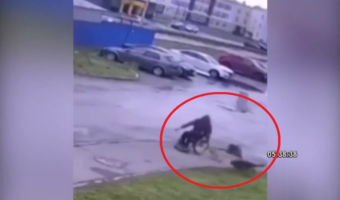 Una cámara de seguridad captó el preciso momento en que un hombre en silla de ruedas se enfrentó a una jauría de perros callejeros para proteger a su pequeño cachorro, en una calle de Rusia.