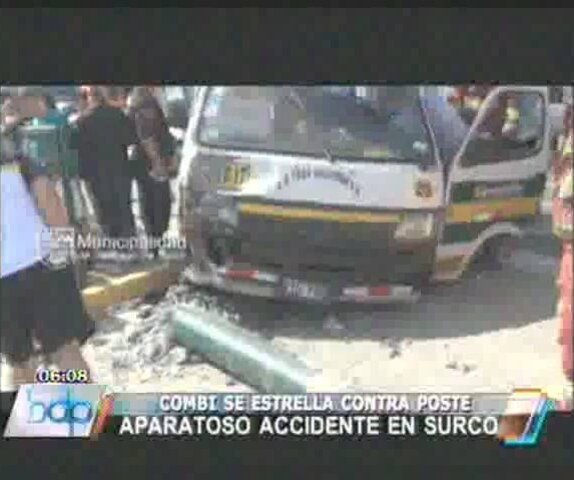 Un aparatoso accidente de tránsito en el cruce se las avenidas Tomás Marsano y Andrés Tinoco en Surco dejó dos personas heridas. El hecho se registró luego que dos combis realizaran competencia por recoger pasajeros