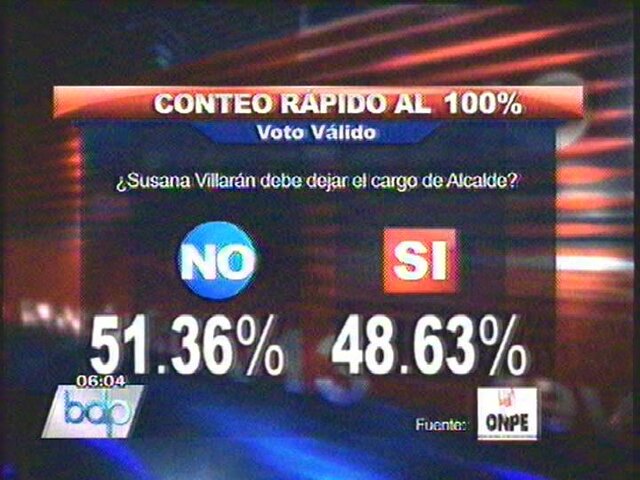 El jefe de la ONPE, Mariano Cucho, brindó los resultados del conteo rápido al 100% de la consulta popular. El No obtuvo 51.36% y el Sí alcanzó 48.63%, esto confirmaría la permanencia de la actual burgomaestre, pero 20 de sus regidores dejarían el cargo.
