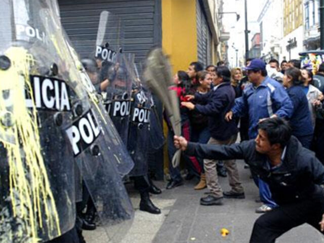 Los empleados administrativos del Ministerio de Salud intentaron ingresar a la Plaza de Armas como parte de las protestas que realizan para exigir mejoras salariales, sin embargo, se encontraron con un fuerte resguardo policial en el Jirón de la Unión. Los trabajadores pugnaban por ingresar a la plaza, por lo que iniciaron una violenta gresca con los agentes del orden en la que resultaron detenidos dos trabajadores y varios denunciaron haber sido maltratados.