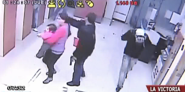 Cámaras de seguridad captan sorprendete atraco a una cabina de internet en cuestión de segundos. Los delincuentes ingresaron con armas de fuego a este local de La Victoria y retuvieron a todos sus clientes, a quienes además maltrataron y amenazaron con matarlos. Luego de desmantelar las computadoras intentaron escapar sin llamar la atención, pero fueron interceptados por un escuadrón policial de la comisaría Apolo, quienes redujeron a los ladrones, luego de un fuerte enfrentamiento con armas de fuego.