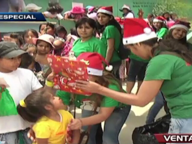 Los pequeños son los que más deben disfrutar la Navidad y esta fue la meta que las educadoras del grupo "Huellas en La Arena" pudieron hacer realidad para los cientos de niños del asentamiento humano Lomas de Ventanilla. Las jóvenes, quienes iniciaron hace un mes la campaña "Uniendo lazos de felicidad" pudieron conseguir juguetes, ropa y dulces para los menores gracias al apoyo de varios televidentes de Panamericana Televisión, empresas y la Municipalidad de Ventanilla. Fueron más de 500 niños los que acudieron al colegio Francisco Bolognesi en el que disfrutaron de un divertido espectáculo en el que también participó nuestro conocido "Yoyito" de Enemigos Públicos.