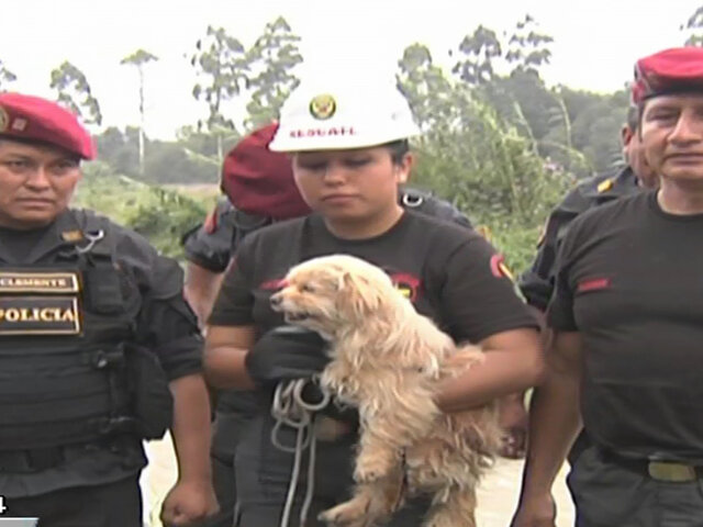 Los miembros del Escuadrón de Emergencias de la Policía Nacional del Perú no dudaron en cruzar las frías aguas del río Rímac para rescatar a una pequeña perrita que cayó en las aguas rápidas.