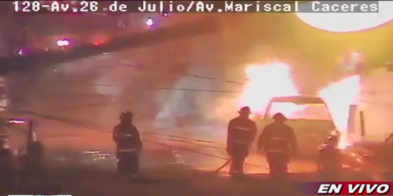 Las cámaras de seguridad de la central de serenazgo de la Municipalidad de Ate registraron los hechos. Al promediar las 4:30 am dos fascinerosos incendiaron el auto del empresario Paolo Félix Martell. Al parecer habrían tirado unas bombas molotov a su unidad porque intentarían obligarlo a pagar cupos. Se hizo necesaria la presencia de dos unidades de bomberos para controlar el fuego.