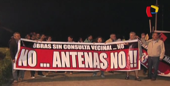 Un grupo de vecinos realizó una protesta con letreros en mano en los exteriores de la vivienda del alcalde de San Isidro, Manuel Velarde. Los residentes acusan que en un parque del distrito se pretende colocar arbitrariamente dos antenas telefónicas. No obstante, aclararon que no están en contra de los dispositivos, sino del lugar donde se pretende colocar.