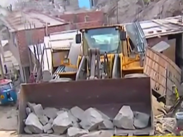 Dos familias se salvaron de sufrir serias consecuencias luego que un cargador frontal cayera encima de dos viviendas, una de ellas de material prefabricado, en la zona de Amauta en el distrito de Ate Vitarte.