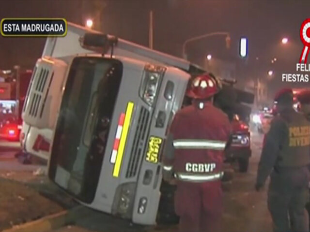Un camión se volcó en el cruce de las avenidas Cesar Vallejo y 1 de Mayo, luego que el conductor perdiera el control de la unidad producto del cansancio.