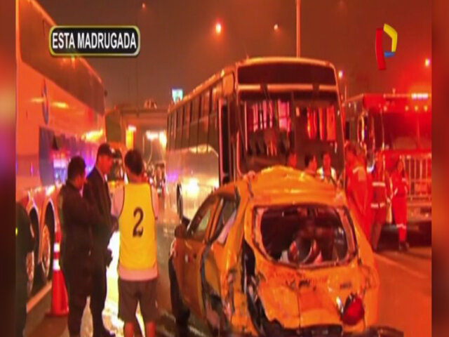 Esta madrugada, un autobús de transporte personal chocó aparatosamente contra un taxi a la altura del óvalo Infantas, en el distrito de Los Olivos.