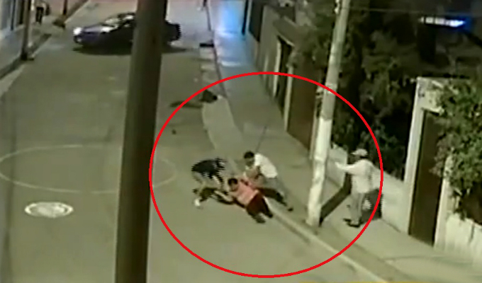 El hombre se resiste al robo pero uno de los delincuentes intenta golpearlo con el arma, mientras que su cómplice lo patea y le rebusca sus pertenencias. Hasta que aparece un vecino quien trata de ayudar al joven pero otro de los hampones intenta atropellarlos.