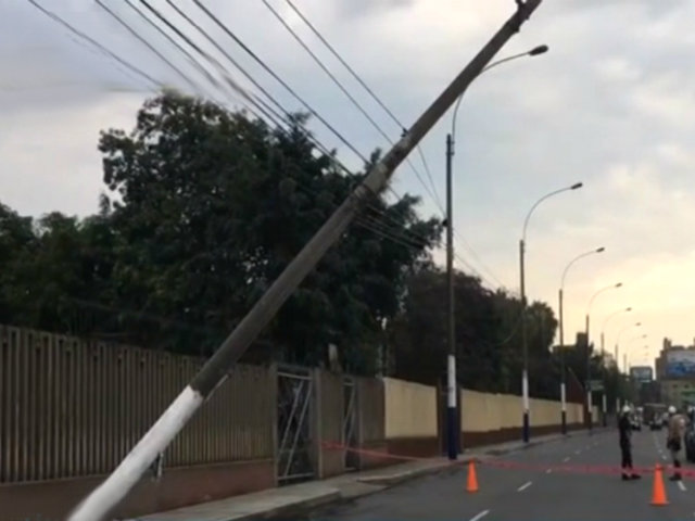 Un peligro inminente. Un poste de alumbrado público se encuentra a punto de hacer en la avenida Túpac Amaru, en el distrito de San Martín de Porres. Y es que un vehículo se habría chocado contra la infraestructura provocando que quede de esa forma.