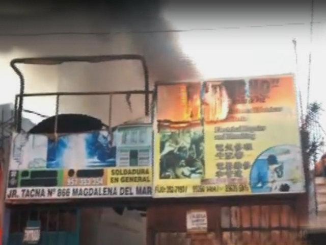 Un voraz incendio se registra desde tempranas horas del día en la cuadra 8 del Jirón Tacna, en el distrito de Magdalena. Un local comercial dedicado a la venta de soldaduras quedó envuelto en llamas y también afectó a una vivienda.