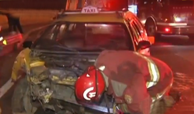 Esta madrugada, un taxista invadió el carril contrario y provocó un cuádruple choque en el kilometro 6 de la Panamericana Sur, en el distrito de Santiago de Surco. Producto del accidente se volcó una grúa que trasladaba un auto.