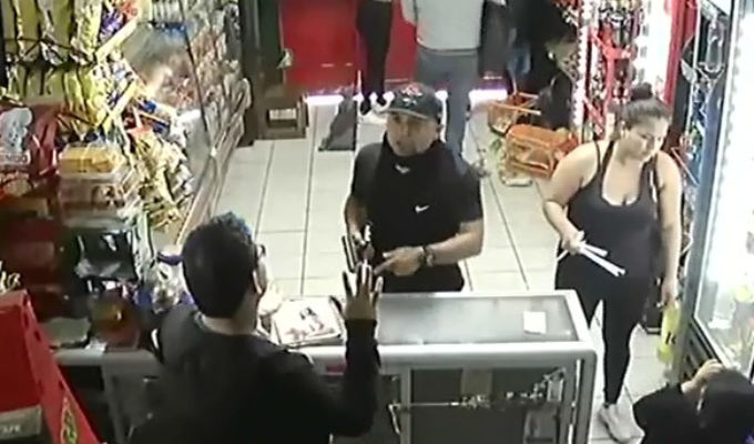 En imágenes captadas por la cámara de seguridad del negocio vemos a tres personas, se trata de dos hombres y una mujer que bajan de una mototaxi e ingresan a la bodega haciéndose pasar por clientes. Entonces se acercan al mostrador y uno de los sujetos saca rápidamente un arma.