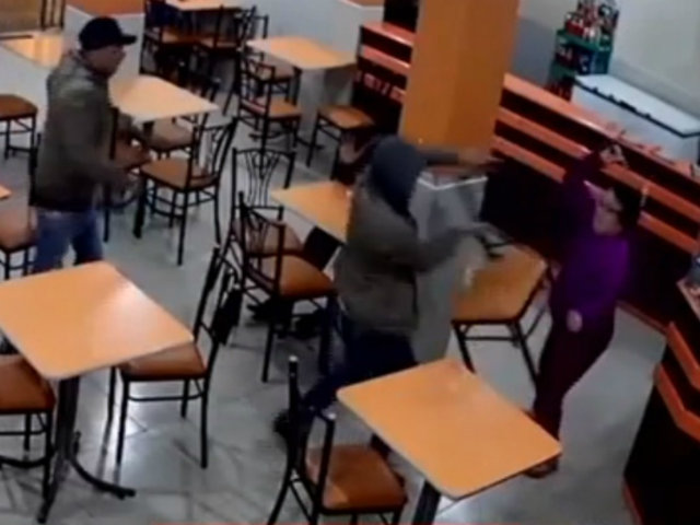 Las cámaras de seguridad captaron lo sucedido. En las imágenes registradas se puede ver a la dueña del local empuñando el utensilio de cocina y golpeando a los delincuentes. Uno de los hampones logra desarmar a la señora; sin embargo, la mujer continuó luchando y levantó una de las sillas para arrojársela.