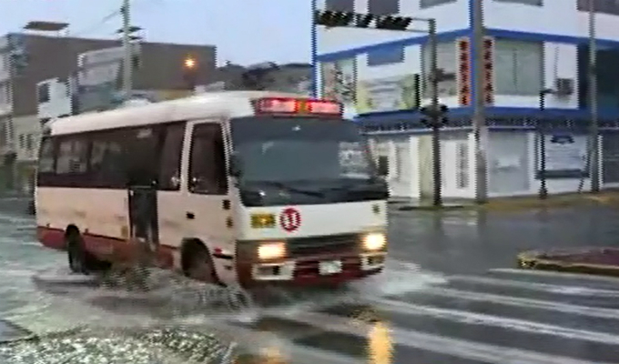 El Agustino: aniego de medianas proporciones afecta avenida Riva Agüero