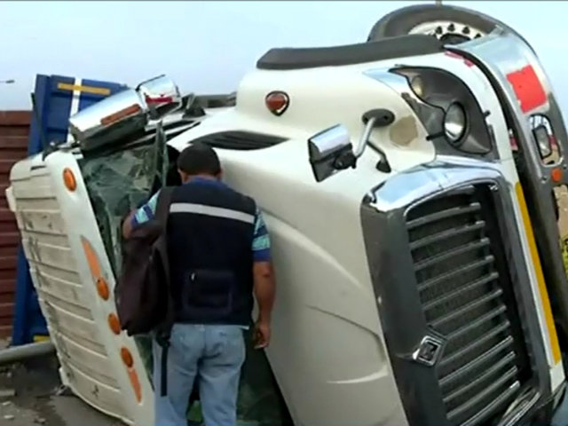 Continúan registrándose accidentes de tránsito en la capital. Esta mañana, un camión container que transportaba menestras terminó volcado. El accidente ocurrió en la cuadra 24 de la avenida Lima, en el distrito de San Martín de Porres.
