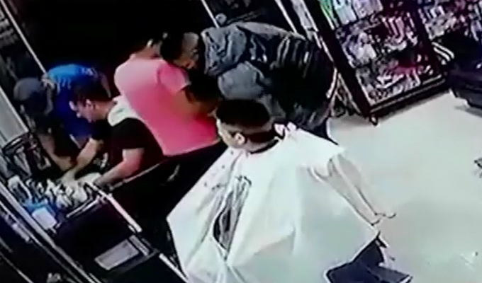 Cámaras de seguridad captaron el preciso momento en que una barbería es asaltada. Como se observan en imágenes, los sujetos irrumpen el local y con arma en mano amenazan tanto a trabajadores como a clientes para despojarlos de sus pertenencias.