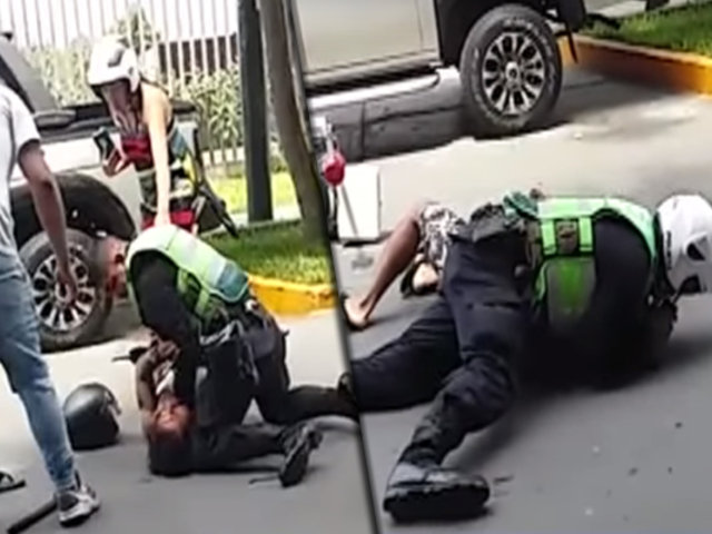 En las imágenes grabadas por por varios transeúntes se registró como el sujeto que había sido intervenido por pasarse la luz roja del semáforo se abalanza contra el agente policial y lo agrede dándole algunos golpes que lo hizo caer al piso.