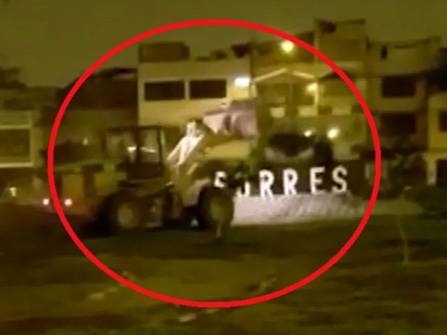 Imágenes grabadas por un usuario dan cuenta como con maquinaria pesada se destruyen las letras de bienvenida al distrito de San Martín de Porres, que se encontraban en el parque Chavín de Huántar.