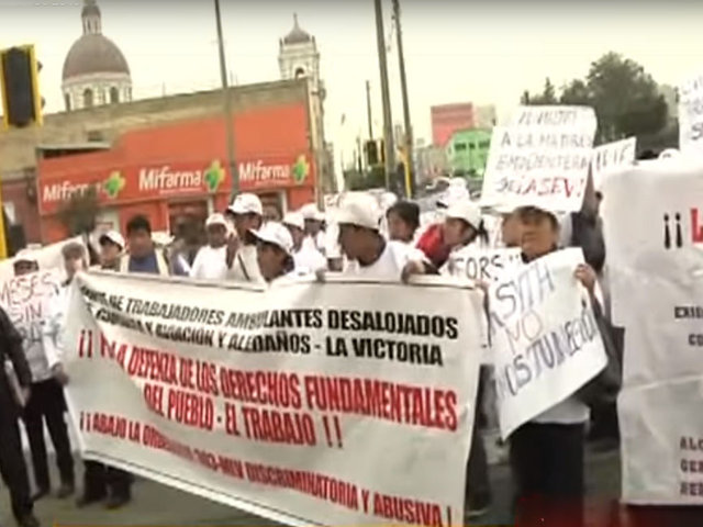 Más de 50 trabajadores de la Asociación de Emolienteros del distrito de La Victoria protestaron en el frontis de la municipalidad, exigiendo al alcalde, George Forsyth, que los deje trabajar.