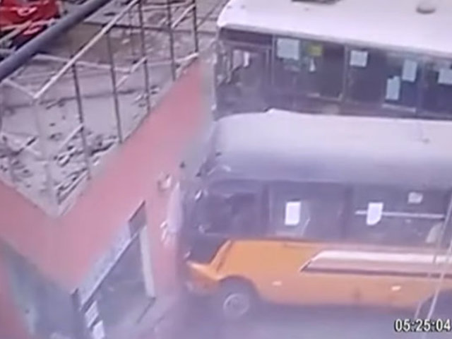 En un cruce de La Victoria, dos buses protagonizaron un estrepitoso accidente cuando uno de ellos estaba volteando hacia la izquierda y el otro, más grande, impactó contra este obligándolo a embestir una caseta de serenazgo.