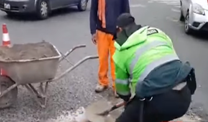 En la avenida Venezuela con jirón morona en Breña un policía se detuvo en medio de la pista para refaccionar un enorme hueco. Utilizando una lampa y cemento, trabajó por varios minutos en su labor.