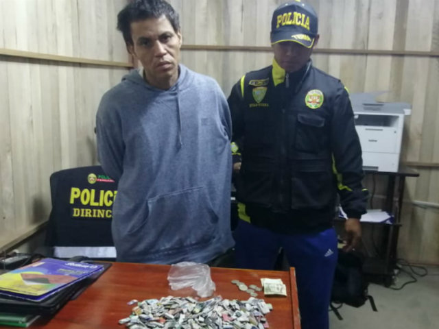 El gerente de seguridad ciudadana de La Molina, general Alberto Jordán, señala que este sujeto comercializaba pasta básica de cocaína en gran cantidad de sobres que guardaba en sus bolsillos o su canguro.
