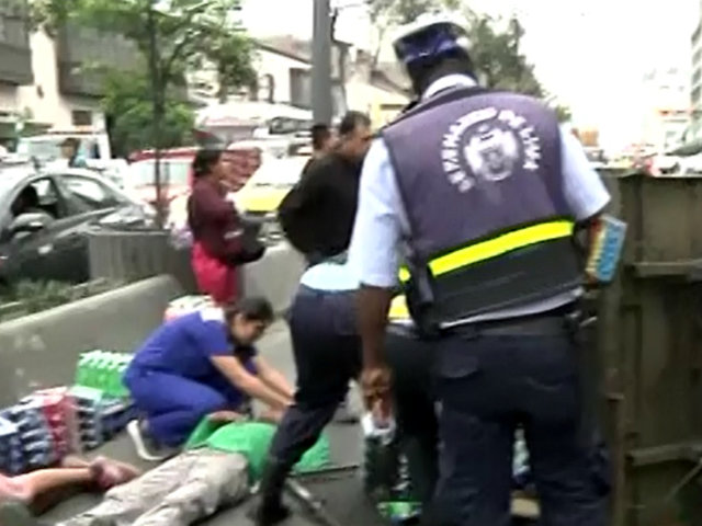 Las dos personas afectadas terminaron con contusiones en todo el cuerpo. La moto de carga estaba repleta de gaseosas y al interior se encontraban dos trabajadores que quedaron atrapados en el furgón tras el impacto.