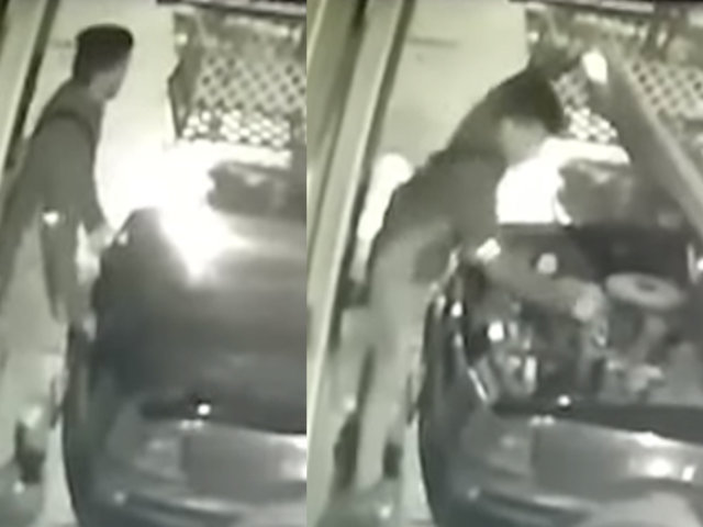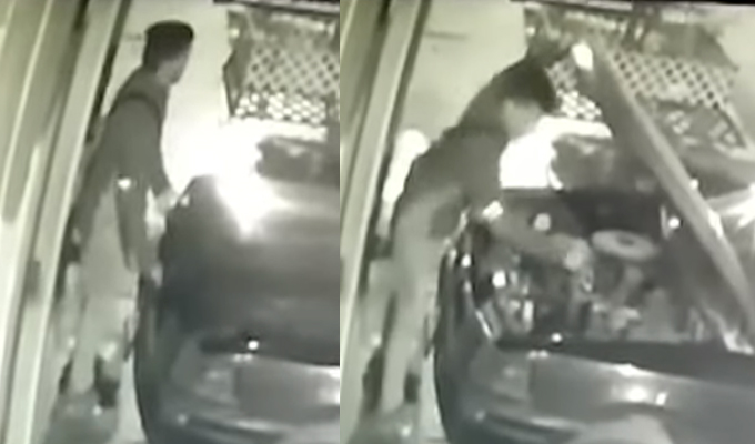 Cámaras de seguridad captaron el preciso momento en el que este ladrón abre el capó del auto estacionado y rápidamente se lleva la batería.