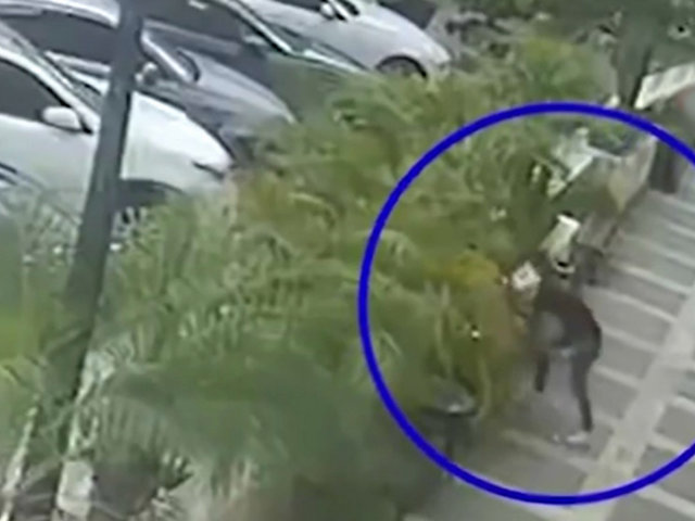 Como se observan en imágenes, el sujeto camina de un lado a otro y observa que la mujer se encontraba sentada en la parte exterior del hotel. Luego sorpresivamente la ataca para robarle su celular.